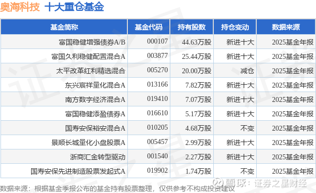 重仓奥海科技的前十大公募基金请见下表: