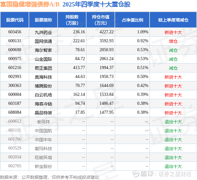 根据2025基金年报公募基金重仓股数据,重仓该股的公募基金共13家,其中持有数量最多的公募基金为富国基金的富国稳健增强债券A/B。富国稳健增强债券A/B目前规模为20.83亿元,最新净值1.352(3月20日),较上一交易日下跌0.15%,近一年上涨4.16%。该公募基金现任基金经理为俞晓斌。俞晓斌在任的基金产品包括:富国泰利定开债发起式,管理时间为2016年12月30日至今,期间收益率为49.68%;富国两年期理财债券A,管理时间为2018年12月14日至今,期间收益率为24.29%;富国天盈债券(LOF)A,管理时间为2019年8月26日至今,期间收益率为28.14%。