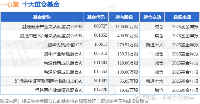 根据2025基金年报公募基金重仓股数据,重仓该股的公募基金共8家,其中持有数量最多的公募基金为融通基金的融通健康产业灵活配置混合A/B。融通健康产业灵活配置混合A/B目前规模为14.79亿元,最新净值2.621(3月20日),较上一交易日下跌1.95%,近一年上涨5.73%。该公募基金现任基金经理为万民远。万民远在任的基金产品包括:融通鑫新成长混合A,管理时间为2021年10月8日至今,期间收益率为27.06%;融通价值成长混合A,管理时间为2022年7月18日至今,期间收益率为24.9%;融通医疗保健行业混合A/B,管理时间为2023年3月15日至今,期间收益率为-24.78%。