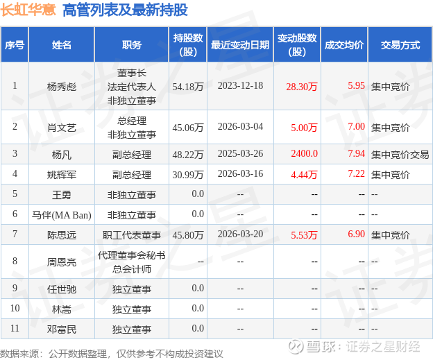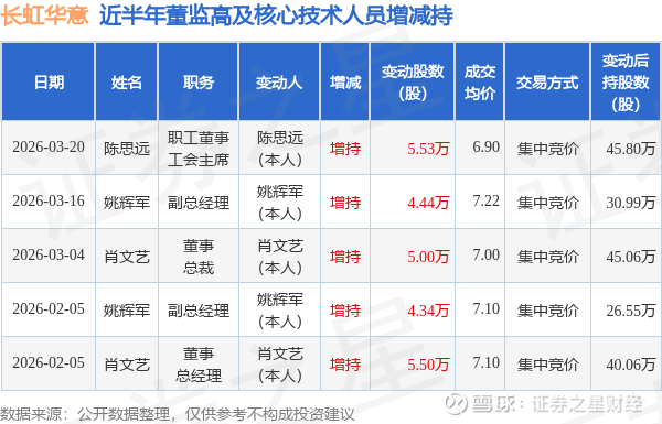 证券之星消息,根据3月23日市场公开信息、上市公司公告及交易所披露数据整理,长虹华意(000404)最新董监高及相关人员股份变动情况:2026年3月20日公司职工董事,工会主席陈思远共增持公司股份5.53万股,占公司总股本为0.0079%。变动期间公司股价下跌2.68%,3月20日当日收盘报6.89元。