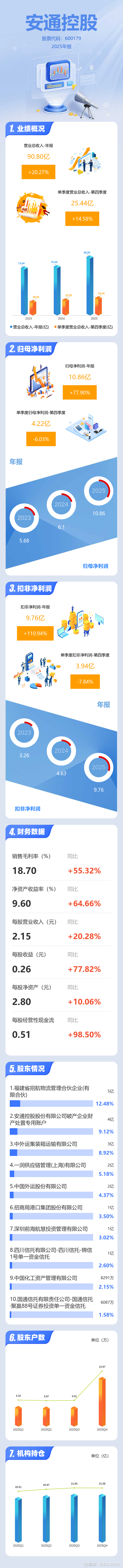 证券之星消息,安通控股2025年年报显示,当年度公司主营收入90.8亿元,同比上升20.28%;归母净利润10.86亿元,同比上升77.9%;扣非净利润9.76亿元,同比上升110.95%;其中2025年第四季度,公司单季度主营收入25.44亿元,同比上升14.58%;单季度归母净利润4.22亿元,同比下降6.03%;单季度扣非净利润3.94亿元,同比下降7.84%;负债率24.38%,投资收益4100.77万元,财务费用3691.62万元,毛利率18.7%。