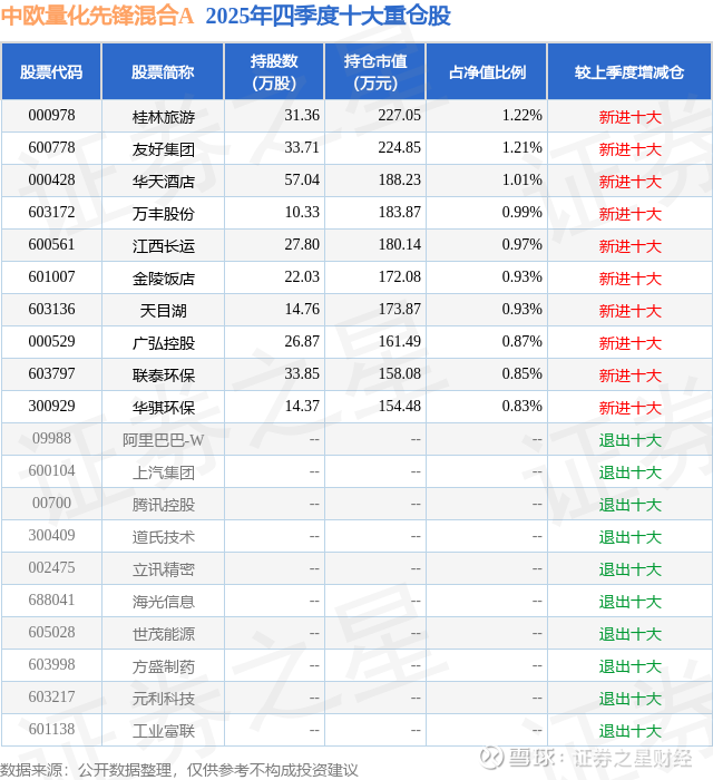 中欧量化先锋混合A的前十大重仓股如下: