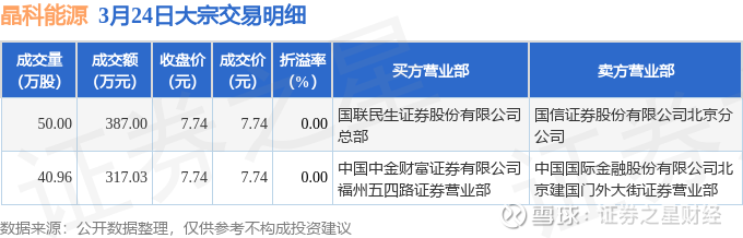 证券之星消息,3月24日晶科能源发生大宗交易,交易数据如下: