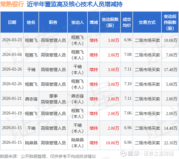 证券之星消息,根据3月24日市场公开信息、上市公司公告及交易所披露数据整理,常熟银行(601128)最新董监高及相关人员股份变动情况:2026年3月23日公司高级管理人员程鹏飞共增持公司股份3.0万股,占公司总股本为0.0009%。变动期间公司股价下跌2.26%,3月23日当日收盘报6.92元。