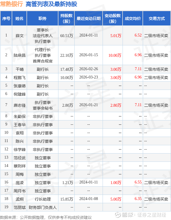 常熟银行的高管列表及最新持股情况如下: