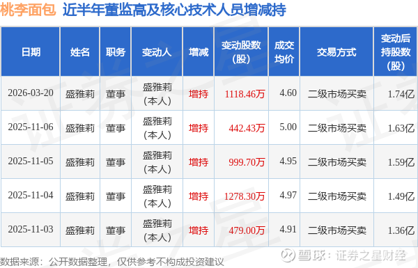 证券之星消息,根据3月24日市场公开信息、上市公司公告及交易所披露数据整理,桃李面包(603866)最新董监高及相关人员股份变动情况:2026年3月20日公司董事盛雅莉共增持公司股份1118.46万股,占公司总股本为0.6992%。变动期间公司股价下跌1.17%,3月20日当日收盘报5.05元。