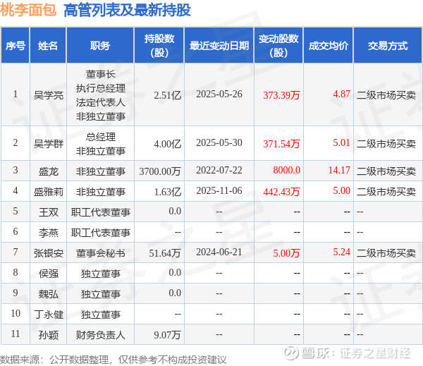 桃李面包近半年内的董监高及核心技术人员增减持详情如下: