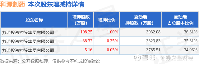 证券之星消息,3月24日科源制药发布公告《科源制药:关于控股股东及其一致行动人权益变动触及1%整数倍暨增持股份计划完成公告》,其股东力诺投资控股集团有限公司于2026年3月18日至2026年3月23日间合计增持151.73万股,占公司目前总股本的1.4011%,变动期间该股股价下跌9.5%,截止3月23日收盘报43.9元。