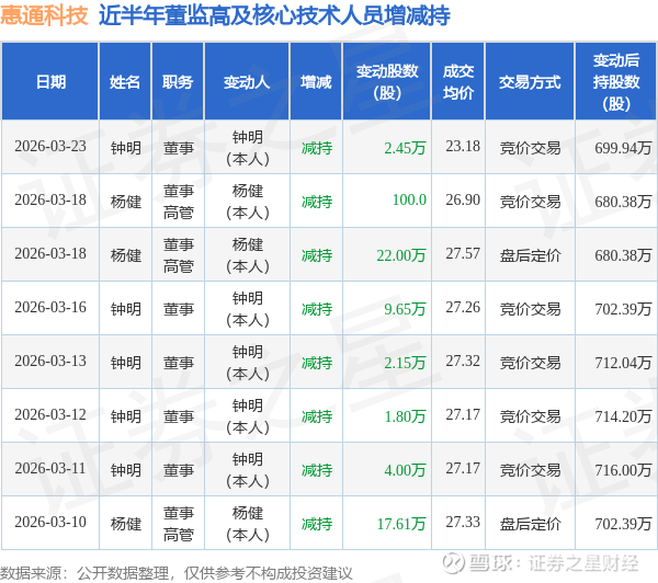 证券之星消息,根据3月24日市场公开信息、上市公司公告及交易所披露数据整理,惠通科技(301601)最新董监高及相关人员股份变动情况:2026年3月23日公司董事钟明共减持公司股份2.45万股,占公司总股本为0.0174%。变动期间公司股价下跌7.65%,3月23日当日收盘报23.18元。
