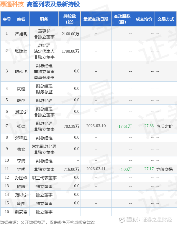 惠通科技近半年内的董监高及核心技术人员增减持详情如下: