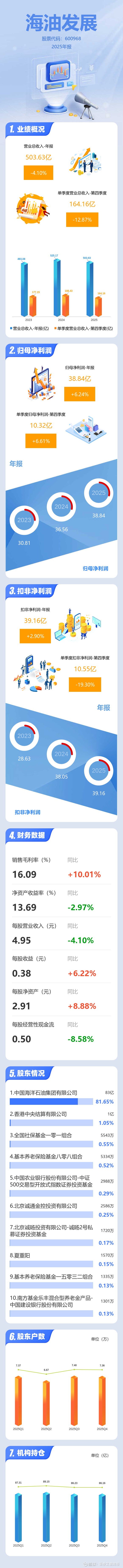 证券之星消息,海油发展2025年年报显示,当年度公司主营收入503.63亿元,同比下降4.1%;归母净利润38.84亿元,同比上升6.24%;扣非净利润39.16亿元,同比上升2.91%;其中2025年第四季度,公司单季度主营收入164.16亿元,同比下降12.88%;单季度归母净利润10.32亿元,同比上升6.61%;单季度扣非净利润10.55亿元,同比下降19.3%;负债率40.98%,投资收益4.12亿元,财务费用1954.15万元,毛利率16.09%。