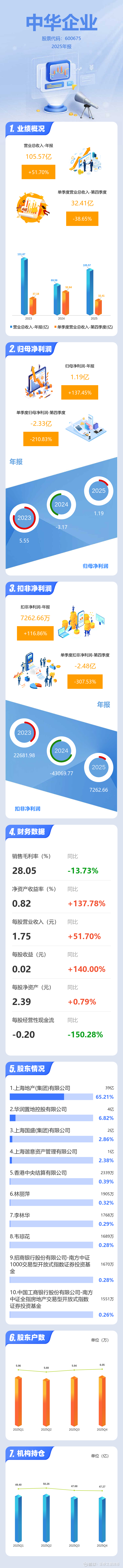 证券之星消息,中华企业2025年年报显示,当年度公司主营收入105.57亿元,同比上升51.71%;归母净利润1.19亿元,同比上升137.45%;扣非净利润7262.66万元,同比上升116.86%;其中2025年第四季度,公司单季度主营收入32.41亿元,同比下降38.66%;单季度归母净利润-2.33亿元,同比下降210.83%;单季度扣非净利润-2.48亿元,同比下降307.54%;负债率67.4%,投资收益2.6亿元,财务费用5.91亿元,毛利率28.05%。