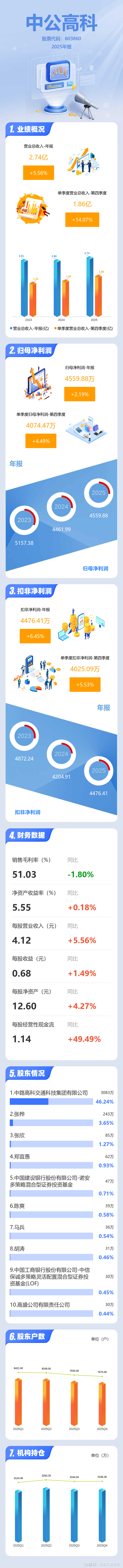 证券之星消息,中公高科2025年年报显示,当年度公司主营收入2.74亿元,同比上升5.57%;归母净利润4559.88万元,同比上升2.19%;扣非净利润4476.41万元,同比上升6.46%;其中2025年第四季度,公司单季度主营收入1.86亿元,同比上升14.07%;单季度归母净利润4074.47万元,同比上升4.49%;单季度扣非净利润4025.09万元,同比上升5.54%;负债率17.29%,财务费用-243.06万元,毛利率51.03%。