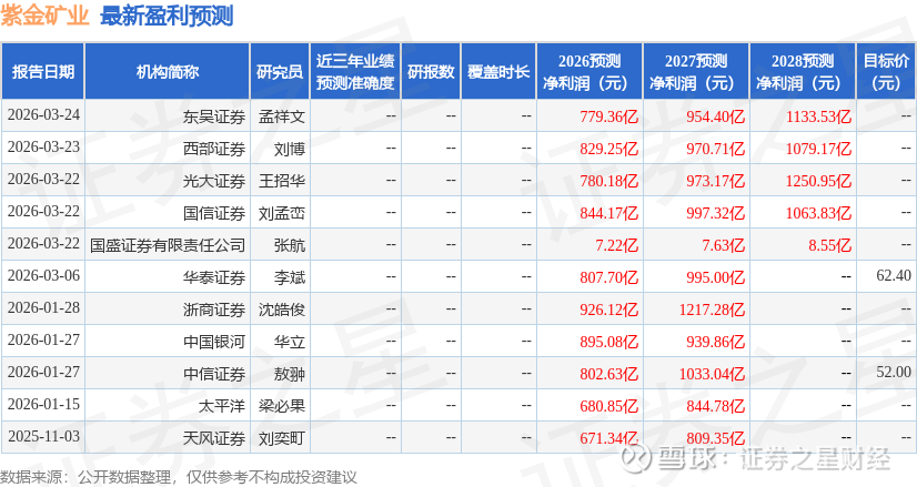 紫金矿业(601899) 报告摘要 事件:2026年3月20日,公司发布2025年年报,报告期内公司实现收入3490.8亿元,同比+15.0%;归母净利润517.8亿元,同比+61.5%;扣非净利润507.2亿元,同比+60.0%。其中,2025Q4公司实现收入948.8亿元,同比+29.5%,环比+9.7%;归母净利润139.1亿元,同比+80.9%,环比-4.5%;扣非净利润166.0亿元,同比+108.9%,环比+32.7%。得益于量价齐升,2025年公司毛利率/净利率为27.7%/18.3%,同比分别为+7.4/5.3pct;ROE/ROA为27.9%/14.0%,同比分别为+5.0/+3.4pct,盈利能力持续提升。至报告期末,公司资产负债率为51.6%,同比-3.6pct,持续下降;净负债率39.9%,同比-26.2pct,财务结构显著优化。 矿产金产量高增,多个项目稳步推进。2025年公司矿产金产量为89.5吨,同比+22.8%,增加16.6吨;2026年目标产金105吨,2028年目标产金130-140吨。阿基姆金矿、瑞果多金矿等为未来主要增量项目:(1)加纳阿基姆金矿:2025年4月完成交割以来,实现矿产金5.1吨,2026年计划产金8.5吨,远期有望提升至15吨/年;(2)哈萨克斯坦瑞果多金矿:2025年10月完成交割以来,实现矿产金1.2吨,2026年计划产金6.4吨,远期有望提升至10吨/年;(3)苏里南罗斯贝尔金矿:2025年实现矿产金8.3吨,2026年计划矿产金8.7吨,项目将实施新增500万吨/年处理量的技改扩建,达产后年产金量有望提升至12吨。此外,2026年1月26日,公司发布拟收购联合黄金100%股权的公告,联合黄金预计2025年产金11.7-12.4吨,依托Sadiola项目改扩建及Kurmuk项目建成投产,预计2029年产金将提升至25吨,若完成收购,公司产量有望显著增加。 矿产铜产量小幅增长,巨龙铜业等为主要增量项目。2025年公司矿产铜产量为108.5万吨,同比+1.6%,增加1.7万吨;2026年目标产铜120万吨,2028年目标产铜150-160万吨。巨龙铜业等为未来主要增量项目:(1)巨龙铜业:2025年实现矿产铜19.4万吨,2026年计划矿产铜30万吨,远期有望提升至60万吨/年;(2)卡莫阿铜矿:受矿震影响,2025年实现矿产铜38.9万吨,2026年计划矿产铜38-42万吨,项目正加紧推进卡库拉矿段东区的排水及复产工作。(3)朱诺铜矿:该项目计划于2026年底建成投产,达产后年矿产铜7.6万吨,结合矿区周边资源探边摸底及整合,朱诺矿集区铜矿资源增长潜力显著。(4)雄村铜矿:该项目预计于2026年7月份全面开工建设,2028年6月份建成投产,达产后预计年均产铜4.6万吨。 2026年目标碳酸锂产量12万吨,“两湖两矿”为主要增量项目。2025年公司碳酸锂产量2.5万吨,2026年碳酸锂目标产量12万吨,2028年目标产量27-32万吨。“两湖两矿”为碳酸锂主要增量项目:(1)阿根廷3Q盐湖锂矿:2025年产当量碳酸锂0.58万吨;2026年计划产当量碳酸锂3万吨,一期技改获批达产后产量将提升到3万吨/年,二期4万吨/年碳酸锂项目建设正有序推进;(2)马诺诺锂矿:2026年计划产当量碳酸锂3万吨,一期500万吨/年采选项目有序推进,重介质选矿厂预计2026年6月底建成投产,冶炼厂计划于2026年底建成投产;(3)湘源硬岩锂矿:500万吨/年采选项目及配套电池级碳酸锂冶炼厂于2025年底建成投产,达产后年产电池级碳酸锂3万吨,2025年产当量碳酸锂0.26万吨,2026年计划产当量碳酸锂3万吨;(4)拉果措盐湖锂矿:一期2万吨/年当量碳酸锂项目已于2025年3月正式投产,二期4万吨/年当量碳酸锂项目正加紧规划,2025年产当量碳酸锂1.1万吨,2026年计划产当量碳酸锂2万吨。 内生+外延增厚资源量,自主勘查成本低。至2025年年末,公司总资源量为:金4610吨、铜10968万吨、锂(LCE)1883万吨、银31940吨、钼499万吨、锌(铅)1256万吨;储量为:金1996吨、铜5661万吨、锂(LCE)797万吨、银3231吨、锌(铅)782万吨。2025年公司共计投入权益地勘资金4.53亿元,年度勘查新增探明、控制和推断的权益资源量为:黄金100吨、铜258万吨、钨1.6万吨、钼1.5万吨、银320吨、锌(铅)45万吨,单位勘查成本远低于全球行业平均水平。此外,报告期内公司于境外完成加纳阿基姆金矿、哈萨克斯坦瑞果多金矿两座大型在产金矿收购及交割,合计新增权益金资源量483吨;境内完成藏格矿业控制权收购,新增权益铜资源量207万吨,及战略性矿产钾资源储量;完成安徽沙坪沟钼矿交割,新增权益钼资源量132万吨。 矿产金毛利占矿产品毛利过半,单位销售成本有所上升。2025年公司矿产金/矿产铜收入分别为228.9/225.3亿元,同比分别为+83.3%/+20.1%;矿产金/矿产铜毛利占矿产品总毛利分别为51%/43%;矿产金/矿产铜毛利率分别为64.6%/61.0%,同比分别为+8.9/+0.3pct。矿产金、矿产铜单位销售成本分别为275.2元/克、2.5万元/吨,同比分别为+19.3%/+11.1%。公司矿产品单位销售成本有所上升,主要原因:(1)部分矿山品位下降、运距增加及部分露天矿山剥采比上升;(2)员工薪酬福利水平提升;(3)因黄金价格大幅上涨,以金价为基准计算的权益金同步大幅提升;(4)新并购企业过渡期成本高。 投资建议:我们维持公司2026-2027年盈利预测,并新增2028年预测,预计2026-2028年公司归母净利润分别为681/845/1107亿元。我们认为公司作为全球矿业龙头企业,全球化能力突出、成长确定性强、成本控制能力优异,公司金、银、铜、锂产量持续提升,公司有望充分受益于行业高景气度,维持“买入”评级。 风险提示:需求不及预期;供给超预期释放;美联储紧缩超预期