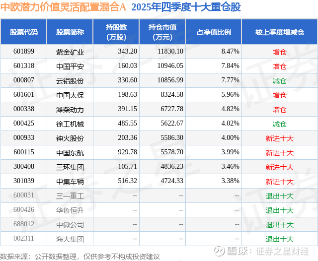 中欧潜力价值灵活配置混合A的前十大重仓股如下: