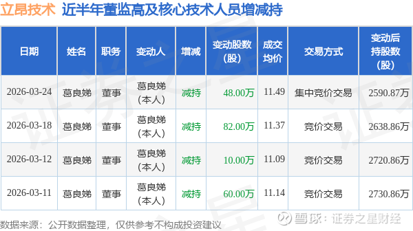 证券之星消息,根据3月25日市场公开信息、上市公司公告及交易所披露数据整理,立昂技术(300603)最新董监高及相关人员股份变动情况:2026年3月24日公司董事葛良娣共减持公司股份48.0万股,占公司总股本为0.1033%。变动期间公司股价上涨10.53%,3月24日当日收盘报11.65元。