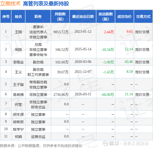 立昂技术近半年内的董监高及核心技术人员增减持详情如下: