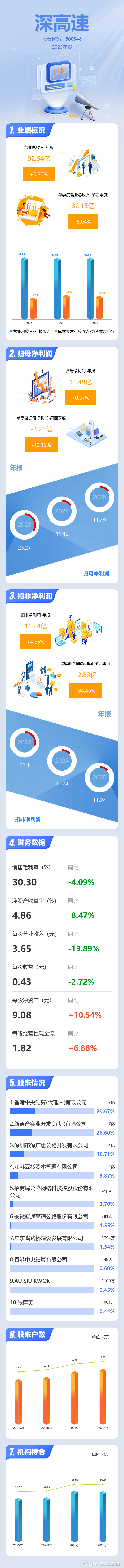 证券之星消息,深高速2025年年报显示,当年度公司主营收入92.64亿元,同比上升0.2%;归母净利润11.49亿元,同比上升0.38%;扣非净利润11.24亿元,同比上升4.66%;其中2025年第四季度,公司单季度主营收入32.15亿元,同比下降5.05%;单季度归母净利润-3.21亿元,同比下降40.17%;单季度扣非净利润-2.83亿元,同比下降84.46%;负债率55.04%,投资收益7.63亿元,财务费用7.43亿元,毛利率30.3%。