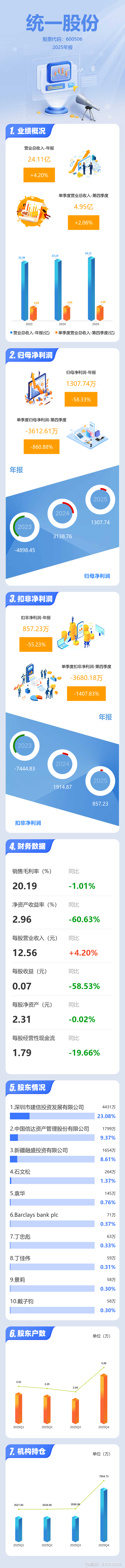 证券之星消息,统一股份2025年年报显示,当年度公司主营收入24.11亿元,同比上升4.2%;归母净利润1307.74万元,同比下降58.34%;扣非净利润857.23万元,同比下降55.23%;其中2025年第四季度,公司单季度主营收入4.95亿元,同比上升2.07%;单季度归母净利润-3612.61万元,同比下降860.89%;单季度扣非净利润-3680.18万元,同比下降1407.83%;负债率55.73%,投资收益27.18万元,财务费用2790.49万元,毛利率20.19%。