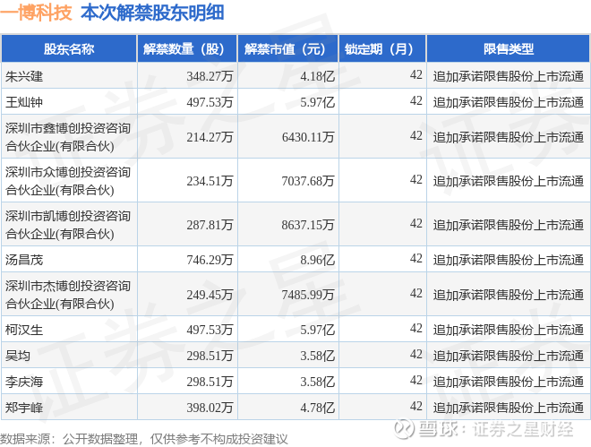 证券之星消息,根据市场公开信息整理,一博科技(301366)于3月26日将有4070.7万股限售股份解禁,为公司追加承诺限售股份上市流通,占公司总股本19.43%。(本次数据根据历史公告整理得出,实际情况以上市公司最新公告为准)本次解禁后,公司还有9253.98万股限售股份,占总股本44.16%。具体如下图所示: