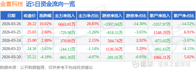 证券之星消息,金富科技3月26日涨停收盘,收盘价28.22元。该股于9点34分涨停,未打开涨停,截止收盘封单资金为7512.16万元,占其流通市值2.72%。