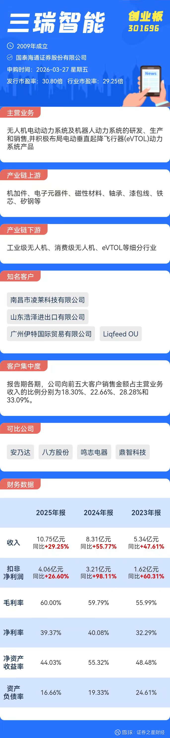募资情况方面,据招股书,三瑞智能原计划拟发行4001万股,募资约7.69亿元,分别用于无人机及机器人动力系统扩产项目(4.07亿元)、研发中心及总部建设项目(2.58亿元)、信息化升级及智能仓储中心建设项目(1.05亿元)。以此次24.68元/股的发行价计算,公司此次实际募资约9.87亿元,与原计划相比超募了约28%。
