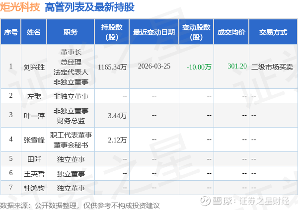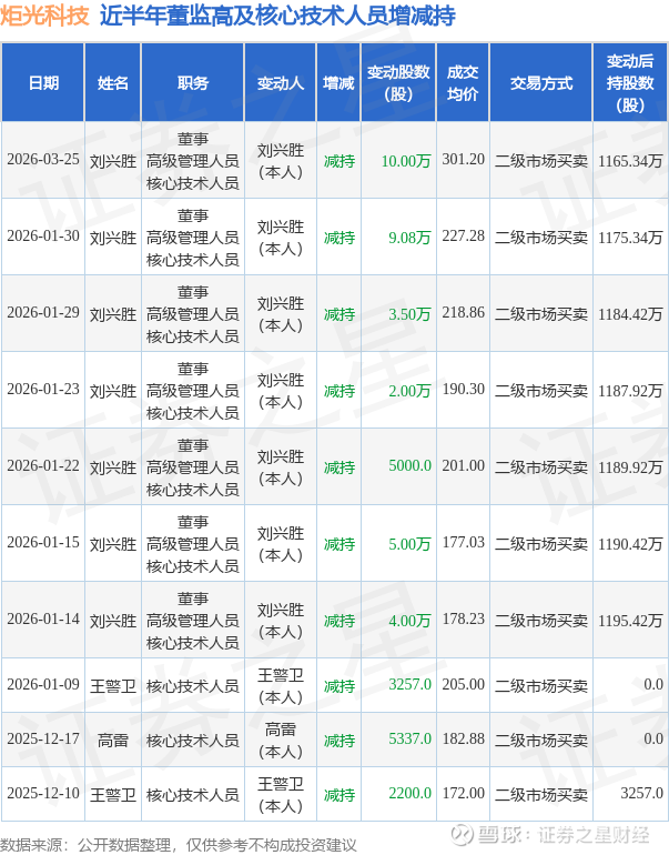 证券之星消息,根据3月26日市场公开信息、上市公司公告及交易所披露数据整理,炬光科技(688167)最新董监高及相关人员股份变动情况:2026年3月25日公司董事,高级管理人员,核心技术人员刘兴胜共减持公司股份10.0万股,占公司总股本为0.1113%。变动期间公司股价上涨10.0%,3月25日当日收盘报332.49元。
