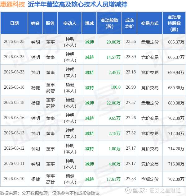 惠通科技近半年内的董监高及核心技术人员增减持详情如下: