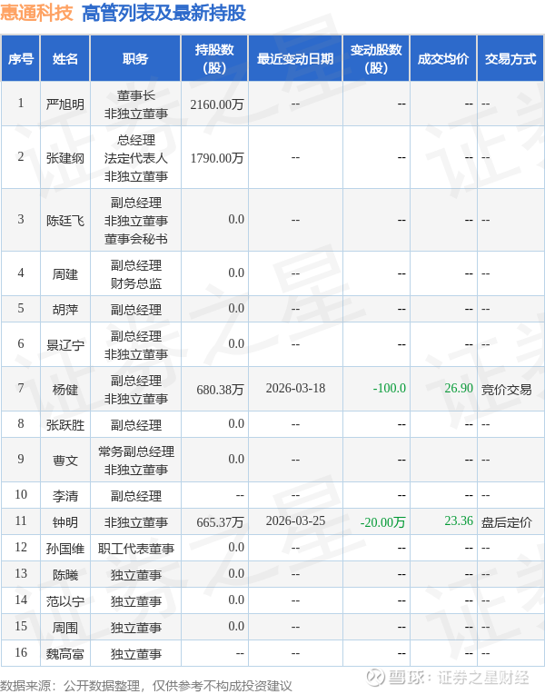 惠通科技的高管列表及最新持股情况如下: