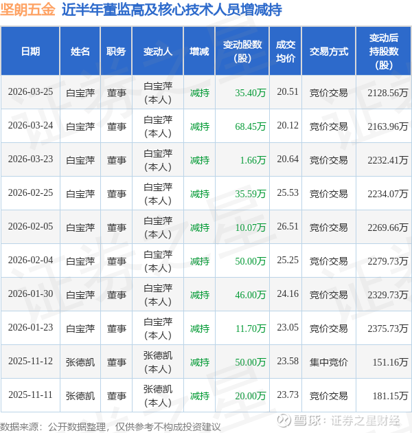 证券之星消息,根据3月26日市场公开信息、上市公司公告及交易所披露数据整理,坚朗五金(002791)最新董监高及相关人员股份变动情况:2026年3月25日公司董事白宝萍共减持公司股份35.4万股,占公司总股本为0.1%。变动期间公司股价上涨0.89%,3月25日当日收盘报20.49元。