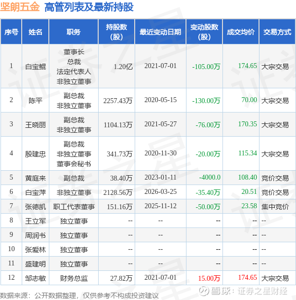 坚朗五金近半年内的董监高及核心技术人员增减持详情如下:
