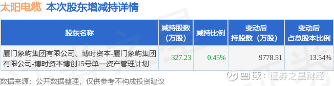 证券之星消息,3月26日太阳电缆发布公告《太阳电缆:关于持股5%以上股东及其一致行动人减持计划期限届满暨实施情况的公告》,其股东厦门象屿集团有限公司、博时资本-厦门象屿集团有限公司-博时资本博创15号单一资产管理计划于2026年1月15日至2026年3月25日间合计减持327.23万股,占公司目前总股本的0.453%,变动期间该股股价下跌0.2%,截止3月25日收盘报9.93元。
