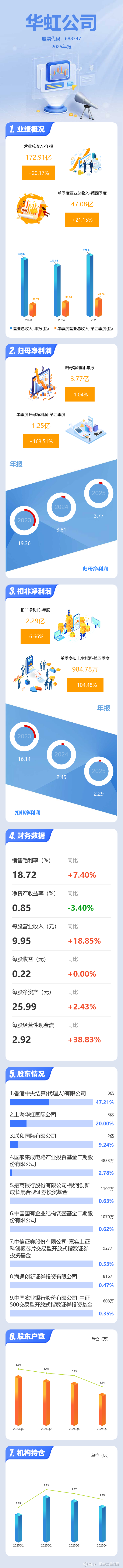 证券之星消息,华虹公司2025年年报显示,当年度公司主营收入172.91亿元,同比上升20.18%;归母净利润3.77亿元,同比下降1.04%;扣非净利润2.29亿元,同比下降6.66%;其中2025年第四季度,公司单季度主营收入47.08亿元,同比上升21.15%;单季度归母净利润1.25亿元,同比上升163.51%;单季度扣非净利润984.78万元,同比上升104.49%;负债率36.98%,投资收益3095.11万元,财务费用1.13亿元,毛利率18.72%。