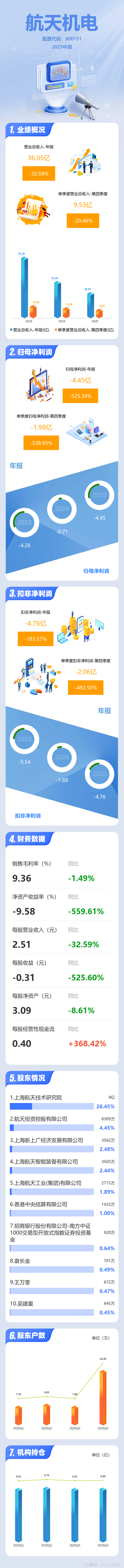 证券之星消息,航天机电2025年年报显示,当年度公司主营收入36.05亿元,同比下降32.6%;归母净利润-4.45亿元,同比下降525.34%;扣非净利润-4.76亿元,同比下降183.58%;其中2025年第四季度,公司单季度主营收入9.53亿元,同比下降20.47%;单季度归母净利润-1.98亿元,同比下降538.85%;单季度扣非净利润-2.06亿元,同比下降492.5%;负债率32.39%,投资收益621.56万元,财务费用-2659.36万元,毛利率9.36%。