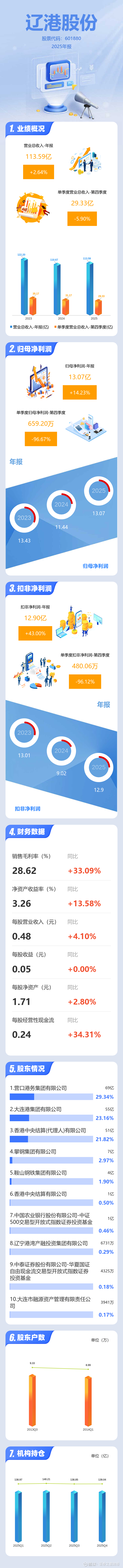 应收款项变动幅度为-42.25%,原因:集中结算应收客户的影响。其他应收款变动幅度为30.29%,原因:应收补贴款增加的影响。其他流动资产变动幅度为-33.63%,原因:增值税留抵税额减少的影响。长期应收款的变动原因:企业间借款增加的影响。长期待摊费用变动幅度为-35.31%,原因:维修费摊销的影响。短期借款变动幅度为-100.00%,原因:信用借款减少的影响。应交税费变动幅度为47.81%,原因:应纳税所得额同比增长的影响。一年内到期的非流动负债变动幅度为-89.36%,原因:偿还应付债券的影响。其他流动负债变动幅度为378.40%,原因:作业包干费由其他非流动负债重分类至其他流动负债的影响。其他非流动负债变动幅度为-100.00%,原因:作业包干费由其他非流动负债重分类至其他流动负债的影响。库存股变动幅度为-100.00%,原因:注销回购股份的影响。营业收入变动幅度为2.64%,原因:集装箱、散粮、油品等业务收入增长的影响。营业成本变动幅度为-6.66%,原因:集装箱物流服务等成本随收入同步减少,同时成本管控深化、环渤海内支线业务结构优化,劳务及外包、能源、维修等成本也有所下降。销售费用变动幅度为-43.48%,原因:本年业务推广减少的影响。管理费用变动幅度为-8.30%,原因:人工及劳务费有所减少。研发费用变动幅度为22.08%,原因:本集团旗下信息公司本年研发项目增加的影响。经营活动产生的现金流量净额变动幅度为32.44%,原因:收回部分客户长期欠款。投资活动产生的现金流量净额变动幅度为-65.32%,原因:固定资产等长期投资增加以及上年两长并表增加流入、收到土地收储补偿款。筹资活动产生的现金流量净额变动幅度为2.90%,原因:偿还有息债务及回购股票。信用减值损失变动幅度为-81.79%,原因:上年应收账款降低等因素的影响。投资收益变动幅度为-114.20%,原因:合联营企业业绩下滑以及上年两长公司非同一控制下企业合并影响投资收益增加的综合影响。所得税费用变动幅度为28.74%,原因:经营利润变化引起应纳税所得额增加的影响。财报数据概要请见下图:
