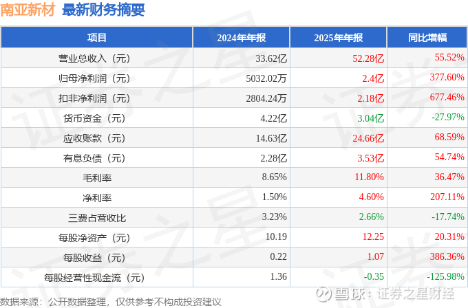 据证券之星公开数据整理,近期南亚新材(688519)发布2025年年报。截至本报告期末,公司营业总收入52.28亿元,同比上升55.52%,归母净利润2.4亿元,同比上升377.6%。按单季度数据看,第四季度营业总收入15.64亿元,同比上升70.59%,第四季度归母净利润8222.9万元,同比上升1474.13%。本报告期南亚新材应收账款上升,应收账款同比增幅达68.59%。