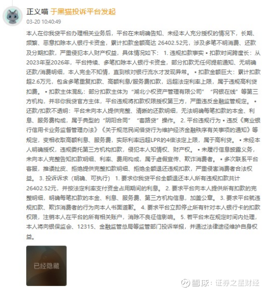 3月20日,一位你我贷平台用户投诉称,其在你我贷办理业务后,平台在未明确告知、未取得本人充分授权的情况下,长期、频繁、恶意扣除本人银行卡资金,自2023年至2026年累计扣款金额高达26402.52元,涉及多笔不明消费、还款及分期扣款。