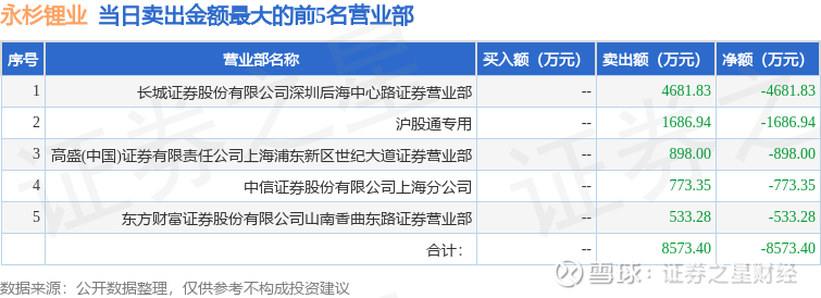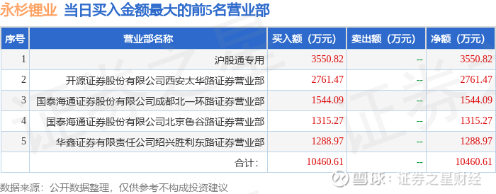证券之星消息,沪深交易所2026年3月27日公布的交易公开信息显示,永杉锂业(603399)因有价格涨跌幅限制的日收盘价格涨幅偏离值达到7%的前五只证券登上龙虎榜。此次是近5个交易日内第1次上榜。