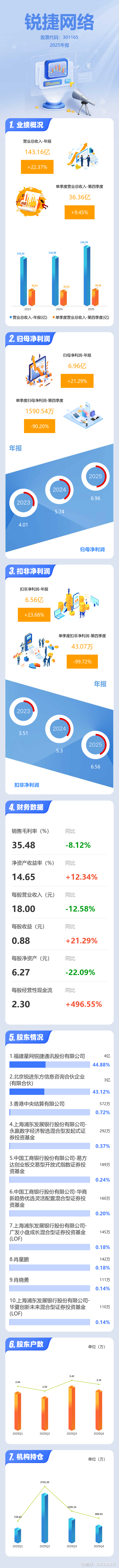 证券之星消息,锐捷网络2025年年报显示,当年度公司主营收入143.16亿元,同比上升22.37%;归母净利润6.96亿元,同比上升21.3%;扣非净利润6.56亿元,同比上升23.68%;其中2025年第四季度,公司单季度主营收入36.36亿元,同比上升9.45%;单季度归母净利润1590.54万元,同比下降90.2%;单季度扣非净利润43.07万元,同比下降99.73%;负债率51.2%,投资收益-17.8万元,财务费用1611.36万元,毛利率35.48%。