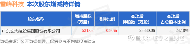 证券之星消息,3月27日雪峰科技发布公告《雪峰科技:新疆雪峰科技(集团)股份有限公司关于控股股东增持股份结果公告》,其股东广东宏大控股集团股份有限公司于2026年3月26日至2026年3月27日间合计增持531.08万股,占公司目前总股本的0.4955%,变动期间该股股价下跌0.21%,截止3月27日收盘报9.39元。