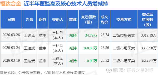 证券之星消息,根据3月27日市场公开信息、上市公司公告及交易所披露数据整理,福达合金(603045)最新董监高及相关人员股份变动情况:2026年3月26日公司董事王达武共减持公司股份34.79万股,占公司总股本为0.2569%。变动期间公司股价下跌3.73%,3月26日当日收盘报28.67元。