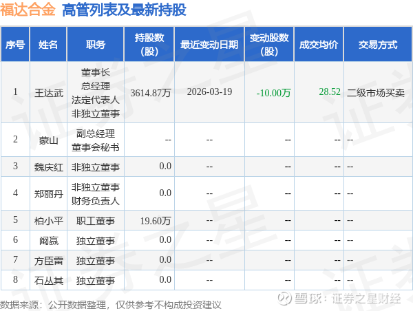 福达合金的高管列表及最新持股情况如下: