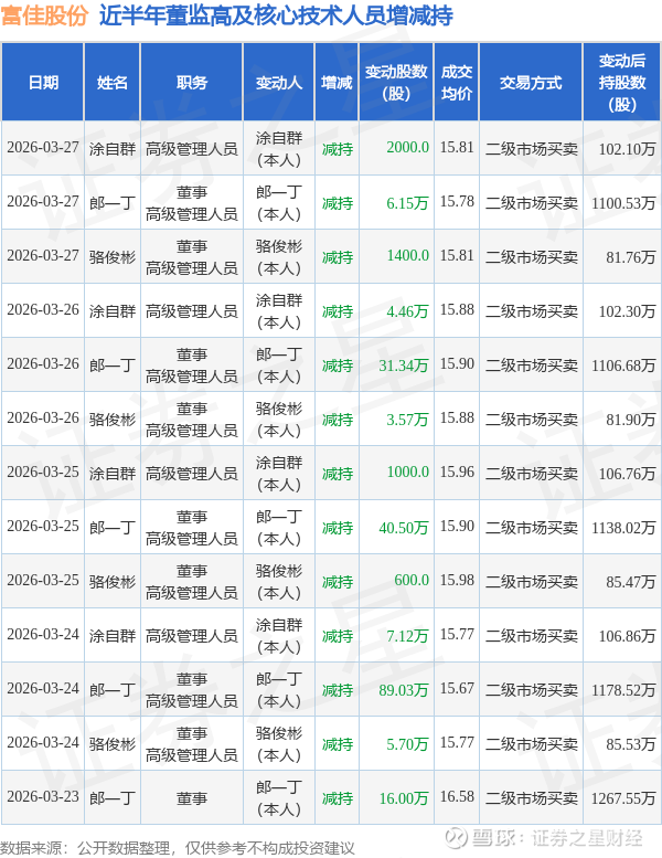 证券之星消息,根据3月27日市场公开信息、上市公司公告及交易所披露数据整理,富佳股份(603219)最新董监高及相关人员股份变动情况:2026年3月26日至2026年3月27日公司董事,高级管理人员郎一丁、高级管理人员涂自群、董事,高级管理人员骆俊彬共减持公司股份45.86万股,占公司总股本为0.0817%。变动期间公司股价下跌1.21%,3月27日当日收盘报15.52元。