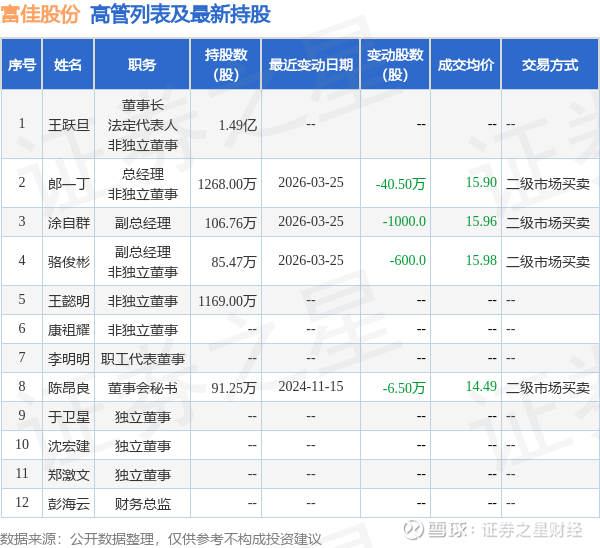 富佳股份的高管列表及最新持股情况如下:
