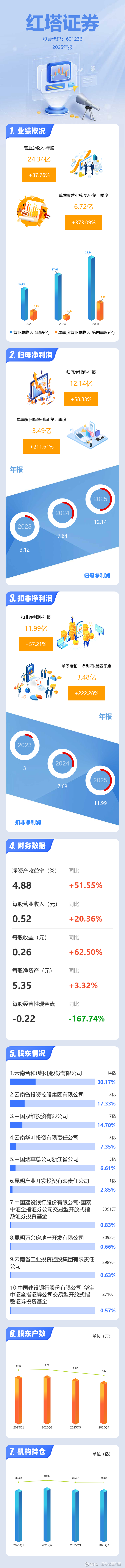 证券之星消息,红塔证券2025年年报显示,当年度公司主营收入24.34亿元,同比上升37.76%;归母净利润12.14亿元,同比上升58.84%;扣非净利润11.99亿元,同比上升57.21%;其中2025年第四季度,公司单季度主营收入6.72亿元,同比上升373.1%;单季度归母净利润3.49亿元,同比上升211.61%;单季度扣非净利润3.48亿元,同比上升222.28%;负债率58.89%,投资收益12.95亿元。