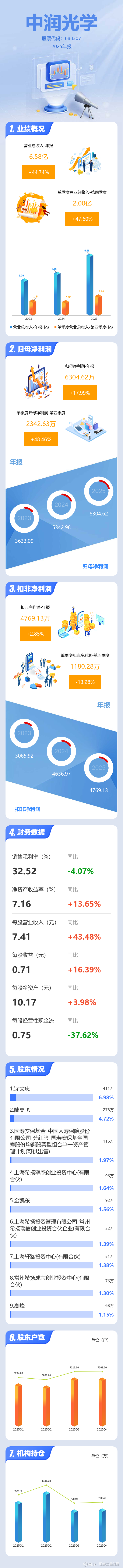 证券之星消息,中润光学2025年年报显示,当年度公司主营收入6.58亿元,同比上升44.75%;归母净利润6304.62万元,同比上升18.0%;扣非净利润4769.13万元,同比上升2.85%;其中2025年第四季度,公司单季度主营收入2.0亿元,同比上升47.6%;单季度归母净利润2342.63万元,同比上升48.47%;单季度扣非净利润1180.28万元,同比下降13.28%;负债率33.91%,投资收益323.37万元,财务费用-584.99万元,毛利率32.52%。