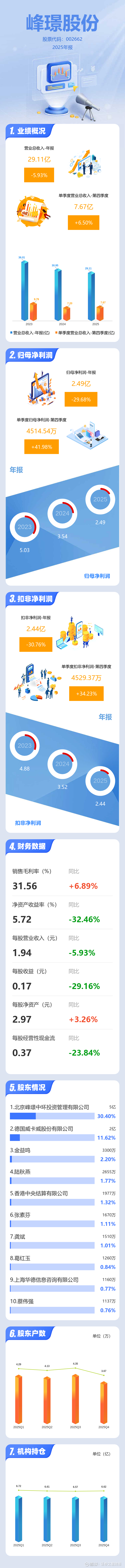 证券之星消息,峰璟股份2025年年报显示,当年度公司主营收入29.11亿元,同比下降5.93%;归母净利润2.49亿元,同比下降29.69%;扣非净利润2.44亿元,同比下降30.77%;其中2025年第四季度,公司单季度主营收入7.67亿元,同比上升6.5%;单季度归母净利润4514.54万元,同比上升41.98%;单季度扣非净利润4529.37万元,同比上升34.24%;负债率27.41%,投资收益1436.19万元,财务费用1542.24万元,毛利率31.56%。