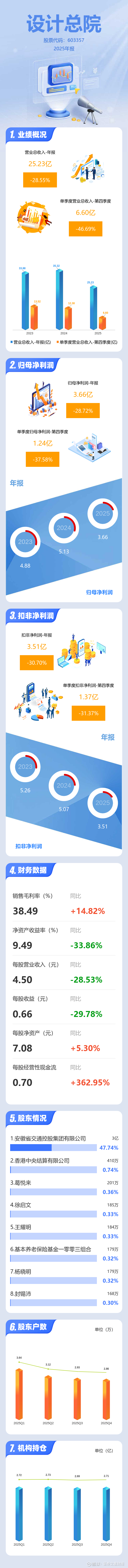 证券之星消息,设计总院2025年年报显示,当年度公司主营收入25.23亿元,同比下降28.56%;归母净利润3.66亿元,同比下降28.72%;扣非净利润3.51亿元,同比下降30.71%;其中2025年第四季度,公司单季度主营收入6.6亿元,同比下降46.69%;单季度归母净利润1.24亿元,同比下降37.58%;单季度扣非净利润1.37亿元,同比下降31.38%;负债率43.56%,投资收益2333.68万元,财务费用763.11万元,毛利率38.49%。