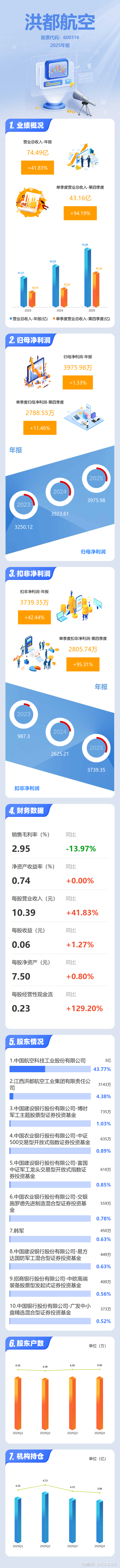证券之星消息,洪都航空2025年年报显示,当年度公司主营收入74.49亿元,同比上升41.83%;归母净利润3975.98万元,同比上升1.33%;扣非净利润3739.35万元,同比上升42.44%;其中2025年第四季度,公司单季度主营收入43.16亿元,同比上升94.2%;单季度归母净利润2788.55万元,同比上升11.47%;单季度扣非净利润2805.74万元,同比上升95.32%;负债率61.63%,投资收益-547.78万元,财务费用-224.46万元,毛利率2.95%。