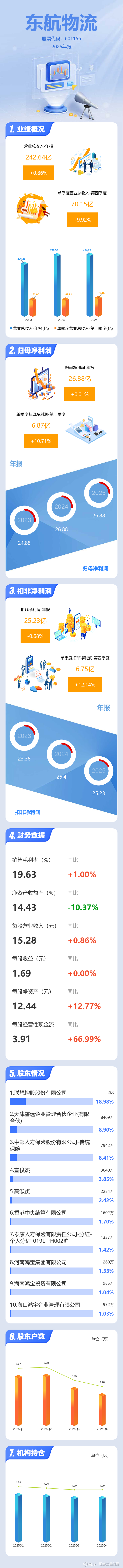 证券之星消息,东航物流2025年年报显示,当年度公司主营收入242.64亿元,同比上升0.87%;归母净利润26.88亿元,同比上升0.02%;扣非净利润25.23亿元,同比下降0.69%;其中2025年第四季度,公司单季度主营收入70.15亿元,同比上升9.93%;单季度归母净利润6.87亿元,同比上升10.72%;单季度扣非净利润6.75亿元,同比上升12.14%;负债率30.65%,投资收益-182.2万元,财务费用1.45亿元,毛利率19.63%。